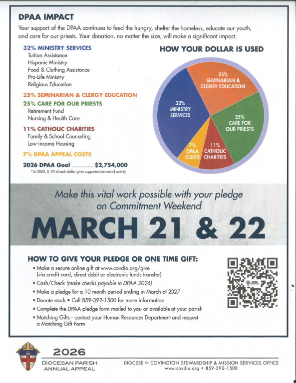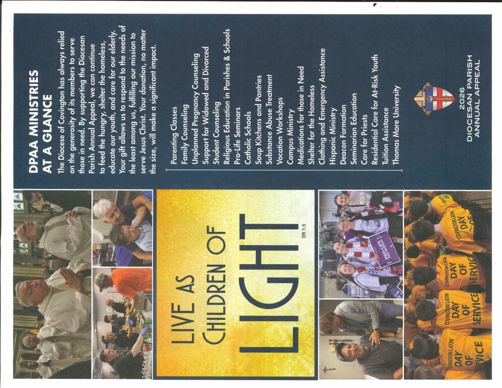 PLEASE NOTE: 2026 MASS INTENTIONS book is open for scheduling. In order to give the opportunity for all parishioners to schedule a Mass intention for their loved ones and to accommodate recently deceased individuals, one weekend and one weekday per month for each deceased may be requested. We appreciate your understanding in this policy. To secure a reservation and/or place an ad, please contact the office directly. Availability is limited, so it is recommended to call as soon as possible to ensure your preferred date. (859)234-5444.