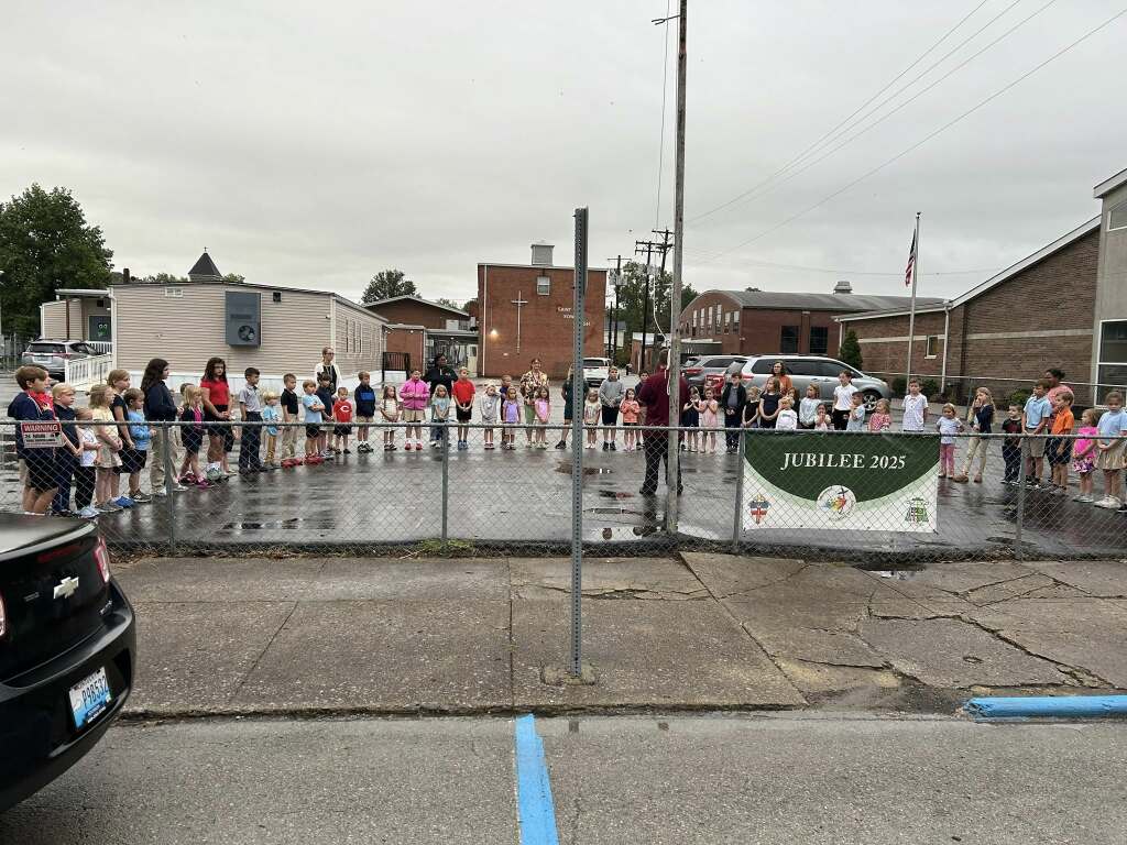 Sept 24, 2025: St Edward students athering at the flagpole for prayer this morning,